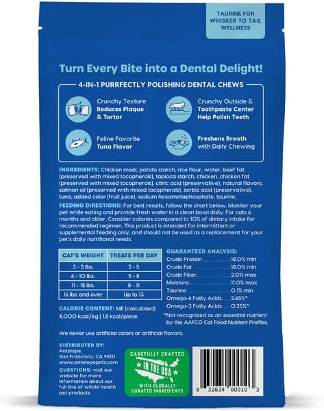 Turn every bite into a dental delight with Ark Naturals Kiss Me-Ow Cleaning Tuna Dental Chews Crunchy Cat Treats. These four-in-one polishing dental chews are crunchy on the outside and have a toothpaste center that helps polish your kitty¡¯s teeth. The toothpaste center is made with SHMP to ensure efficacy and the crunchy texture helps reduce plaque and tartar. These tasty cat treats freshen your kitty¡¯s breath with each bite.