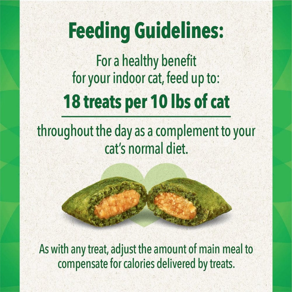 FELINE GREENIES SMARTBITES Hairball Control Treats for Cats are the perfect treat to keep your cat purring all day long. Designed by veterinarians and created with GREENIES FIBERBLEND Formula, these treats help minimize and control hairball formation and support healthy digestion in your adult cat when fed in conjunction with a hairball control diet. Featuring a mix of crunchy and creamy textures, these cat snacks have less than 2 calories, and added vitamins, minerals, and other nutrients for a nutritionally complete and balanced snack. Plus, these irresistible little treats come in a delectable chicken flavor and are made with natural ingredients, plus vitamins. These FELINE GREENIES are the healthy, tasty hairball control treats your cat will love.