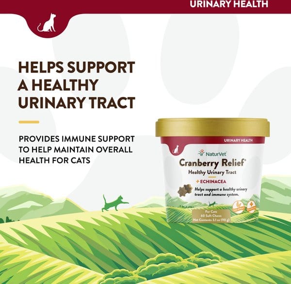 NaturVet Cranberry Relief for Cats is a specially formulated cranberry supplement for cats with added Echinacea to provide essential immune support and promote a healthy urinary tract with optimal bladder function. Help keep your cats urinary tract healthy with our tasty wheat free Cranberry Relief Soft Chews!