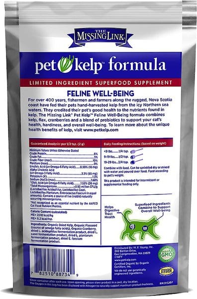 Help your cat feel her absolute best with The Missing Link Pet Kelp Feline Well-Being Supplement. Just one daily scoop provides a dose of beneficial bacteria to your kitty¡¯s digestive tract, offering a boost to the immune and digestive system. The key ingredient in this supplement is Nova Scotia kelp, chosen for its trace minerals, which function to regulate energy and aid in digestion as well as support the immune system, skin and bone systems. This limited-ingredient superfood supplement is packed with the natural goodness of organic kelp, flaxseed, antioxidants and probiotics designed to support overall health. Keep your feline friend in tip-top shape with this easy-to-feed supplement.