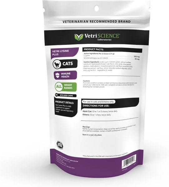 VetriScience Vetri-Lysine Plus Immune Health Bite-Sized Cat Chews provide lysine, an essential amino acid that must be given to your kitty through her food or supplements. This advanced formula supports her respiratory and immune systems with lysine and DMG and also builds collagen to keep her skin and coat healthy and shiny. It¡¯s recommended by veterinarians and easy to administer in a tasty chicken-flavored bite-sized chew.